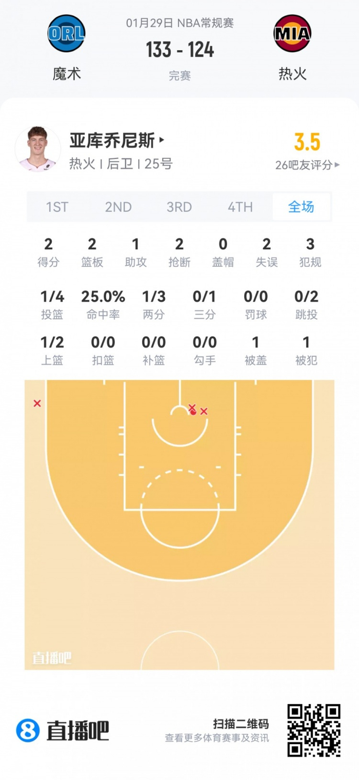 热火首轮20号秀亚库乔尼斯 登场19.9分钟