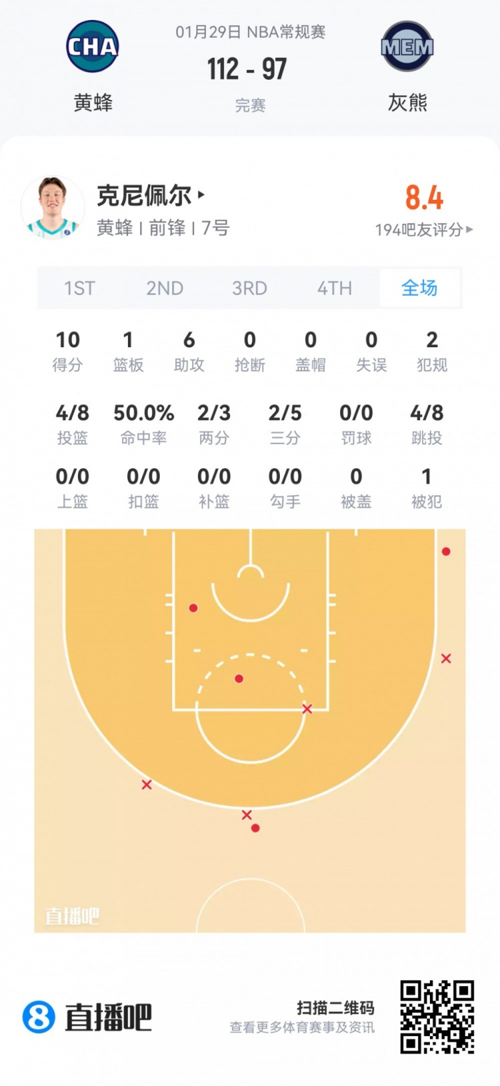 黄蜂首轮4号秀克尼佩尔 登场25.9分钟
