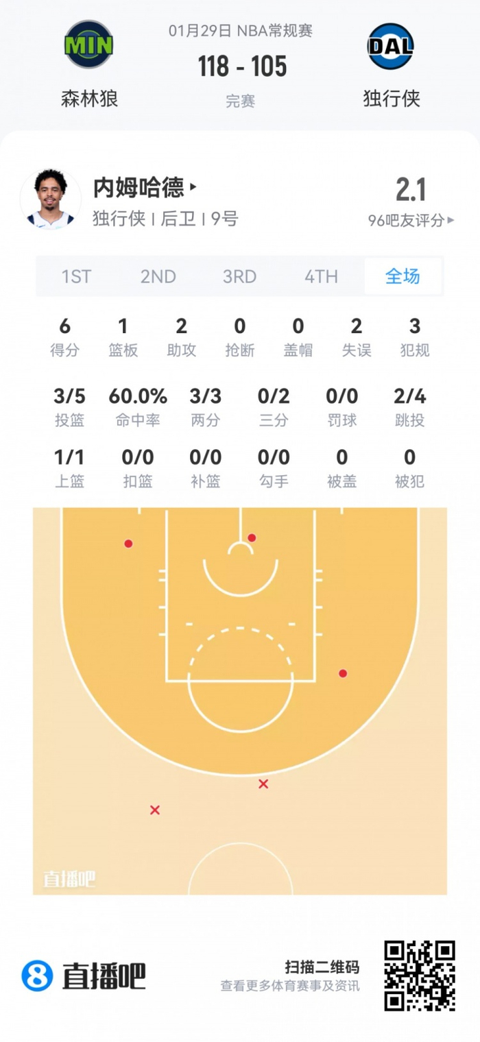独行侠落选秀瑞安·内姆哈德 登场9.9分钟