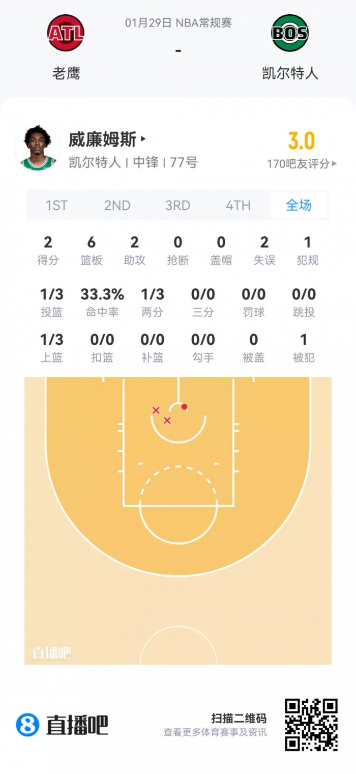 凯尔特人次轮46号秀阿马里·威廉姆斯 登场15.2分钟