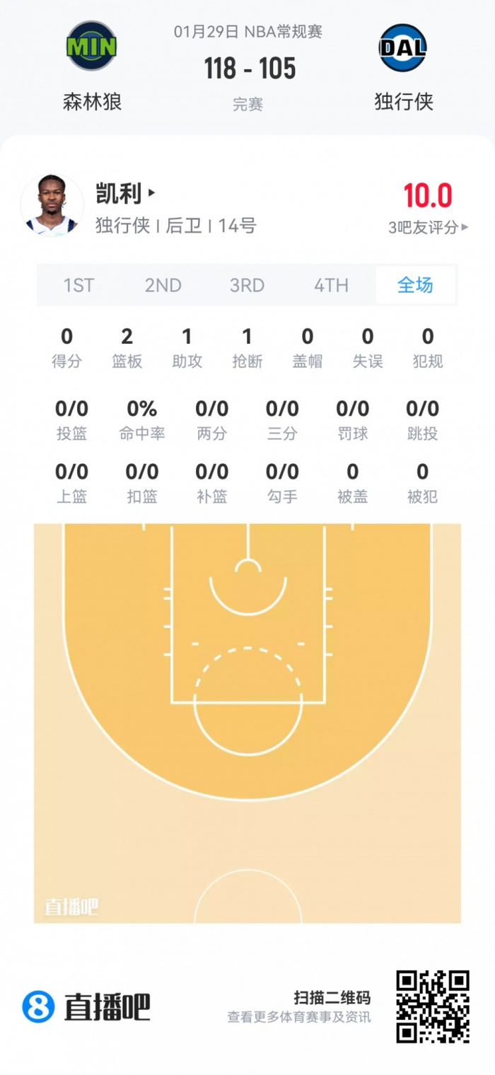 独行侠落选秀凯利 登场4分钟