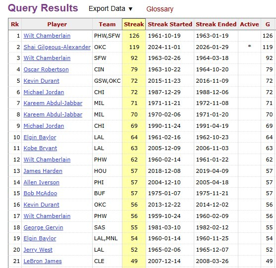 这样,亚历山大已经连续120场至少得到20分,距离历史纪录126场只差6场了。