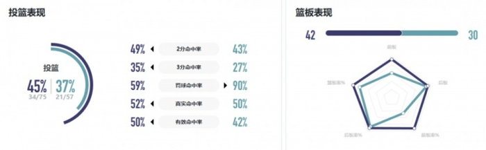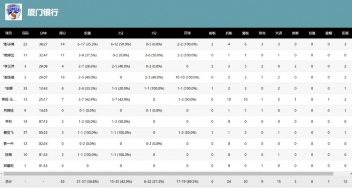球队方面,厦门银行整体投篮命中率37%,低于对方的45%,除了罚球命中率90%明显高于对手,其他方面的命中率都不及对手。篮板上厦门银行同样处于劣势,只有30个明显少于对手的42个。失误数16次是对手的两倍之多。球员方面,彭诗晴、赖婷艺和谢泼德三人得分上双,马歇尔则有10个篮板球入账。