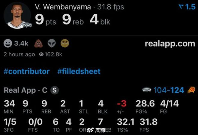 最终,文班亚马14投4中,拿到9分9篮板2助攻4封盖,出现了6次失误,表现很是低迷,马刺队也是以118比130输给了太阳队,不败金身被破,终结了5连胜。